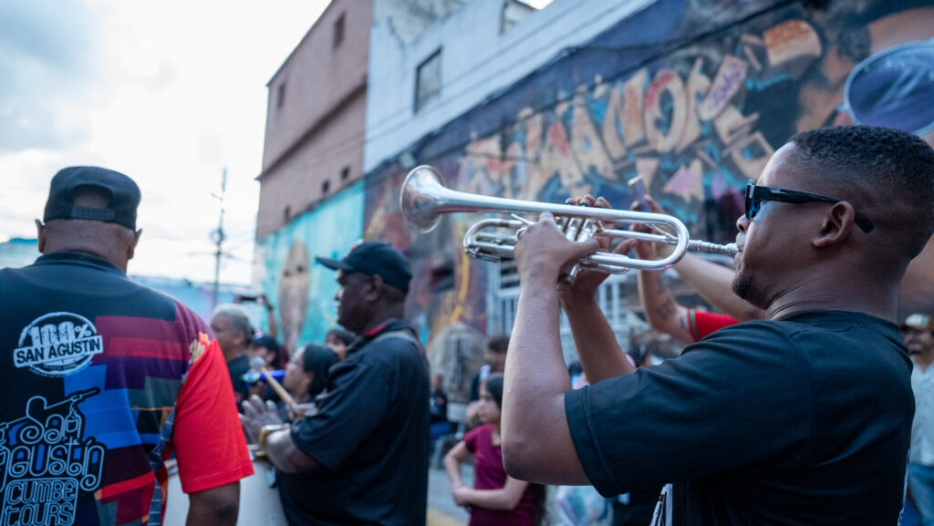 Hoy es la presentación de Ceiba. Estamos en la plaza detrás del teatro Alameda, en la parroquia San Agustín, un barrio conocido por su transformación a través del arte y la cultura. La tarde cae despacio y, poco a poco, la gente va llegando. Aparece la parranda, conformada por compañeras y compañeros de la fundación cultural 100 % San Agustín. Tambores, güiros y trompetas marcan el ritmo. La música convoca. Mujeres, niñas, niños, jóvenes y personas mayores gozan.